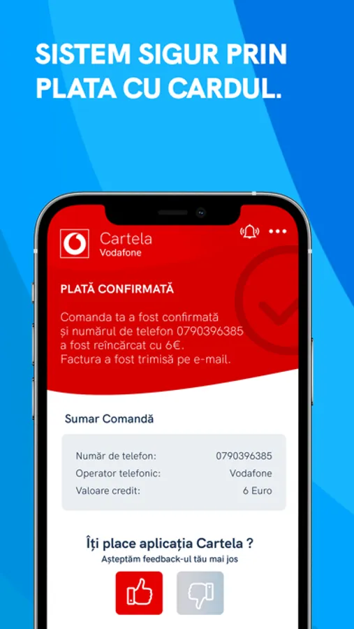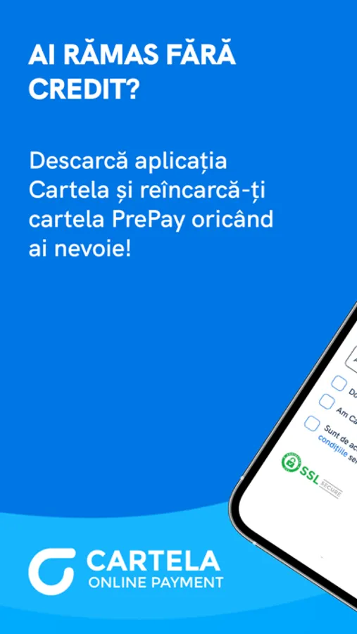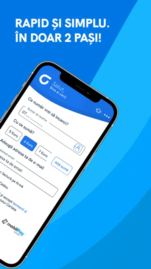 Descarcă aplicația și ai la dispoziție un serviciu sigur și rapid de reîncărcare a cartelei cu doar câteva click-uri. Serviciul și ofertele aplicației sunt disponibile exclusiv online, oferind un proces simplu și intuitiv de reîncărcare, suport și garanția calității.
