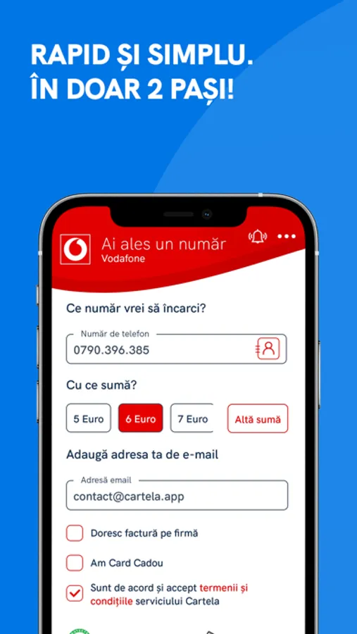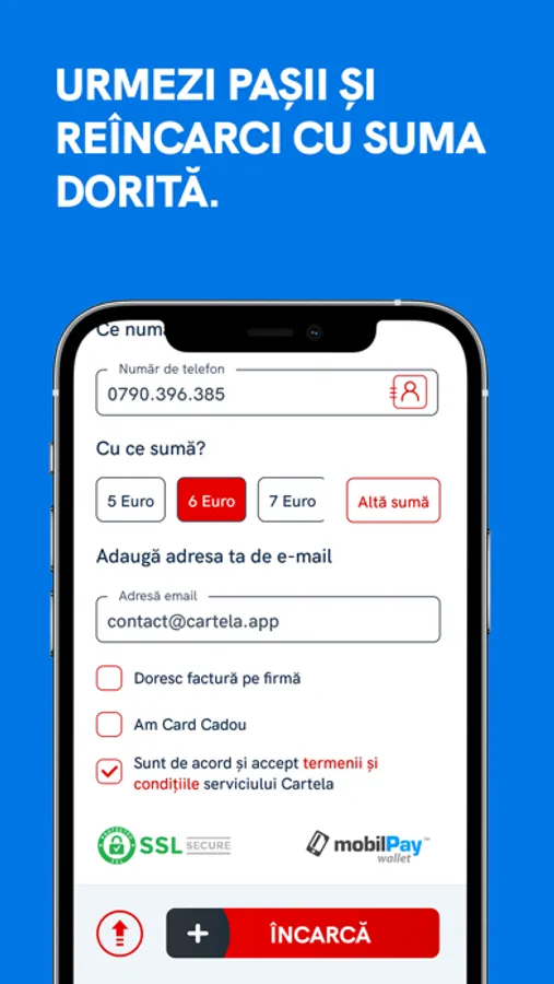 Cu ajutorul aplicației îți poți reîncărca cartela de la principalii operatori de telefonie mobilă din România – Orange, Telekom și Vodafone – la prețuri excelente, rapid și sigur.