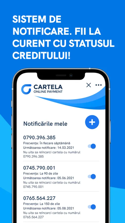 • Sistem de notificare: adaugi numărul, iar la expirarea creditului vei primi o înștiințare din partea noastră;
