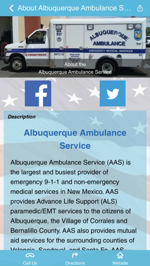 On behalf of the men and women of the Albuquerque Ambulance Service, welcome to our app. Albuquerque Ambulance Service (AAS) is the largest and busiest provider of emergency 9-1-1 and non-emergency medical services in New Mexico. AAS provides Advance Life Support (ALS) paramedic/EMT services to the citizens of Albuquerque, the Village of Corrales and Bernalillo County. AAS also provides mutual aid services for the surrounding counties of Valencia, Sandoval, and Santa Fe. AAS provides services to the Albuquerque International Balloon Fiesta, the Albuquerque International Sunport, the Sandia and Manzano Mountains, Kirtland Air Force Base, Sandia National Laboratory, and medical transportation throughout New Mexico.