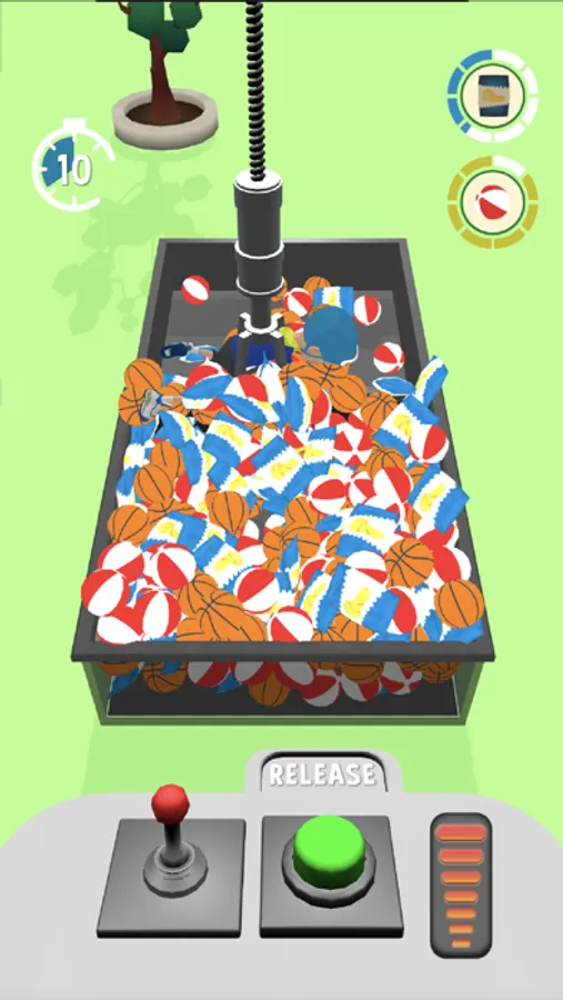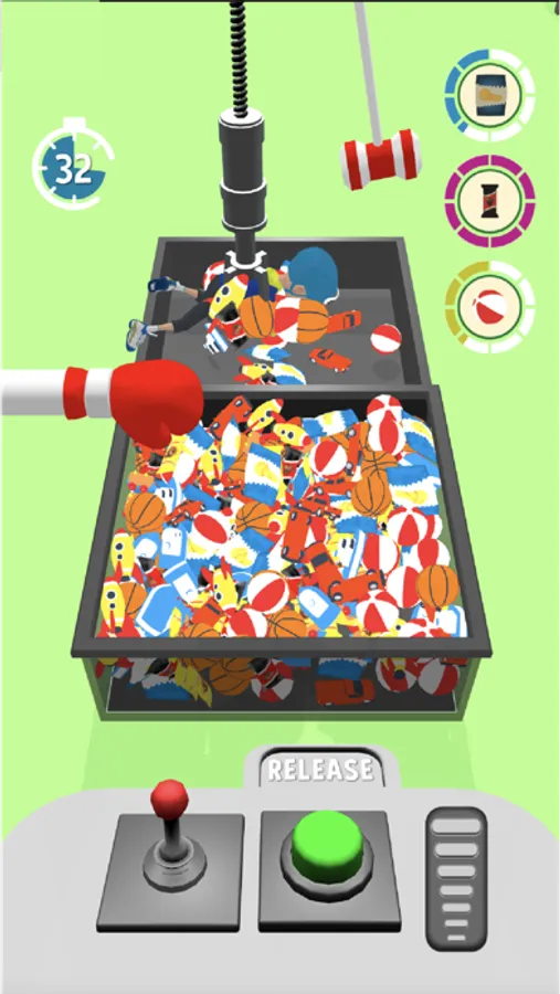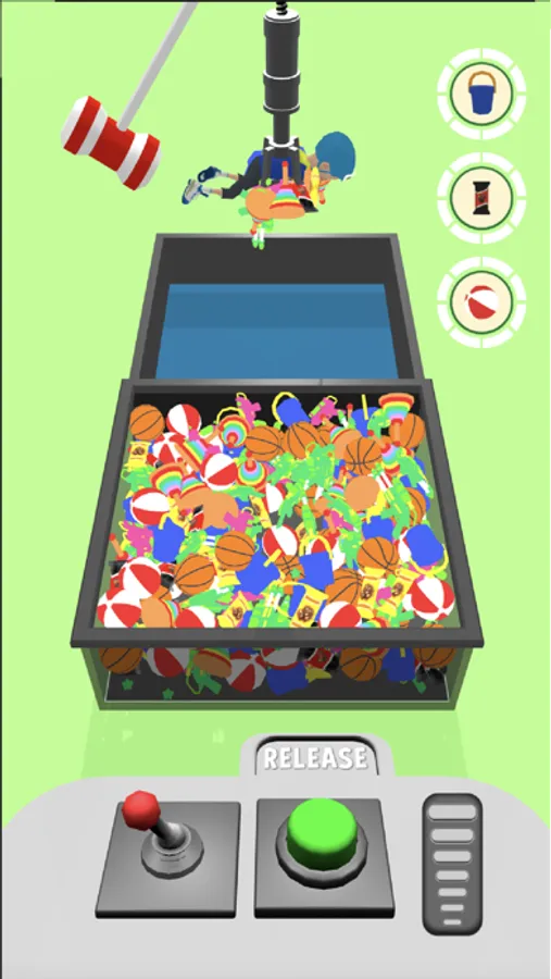 Usual known catcher machine is with a human now. Control machine and get balls, toys, snacks, buckets, pumps, cookies and many other objects as you can.