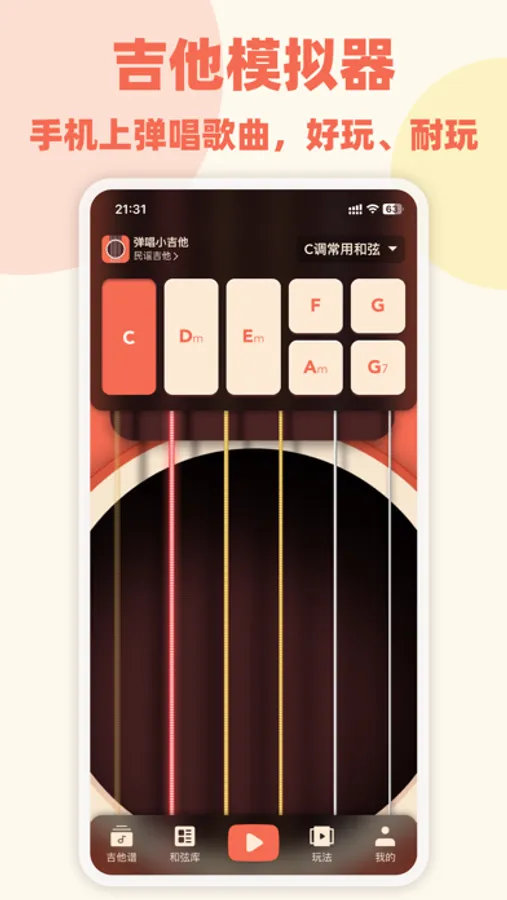专为吉他弹唱爱好者打造的APP,主要功能为【手机吉他模拟器】、【可播放的吉他弹唱六线谱】。
