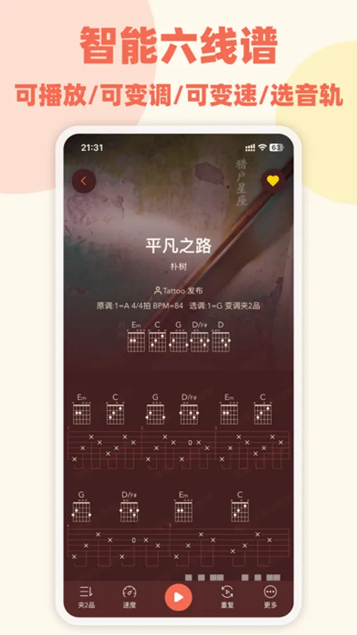 【智能吉他谱】:可以播放演奏音频示例、自动跟随,还可以随意变调,也可以按自己演唱的音高选择,调速以及AB循环更是练习吉他弹唱的好助手。不要再看传统的布局混乱、标记复杂的纸质吉他谱了,学习吉他弹唱一首歌,从上手弹奏练习到熟练,一个智能吉他谱就够了。