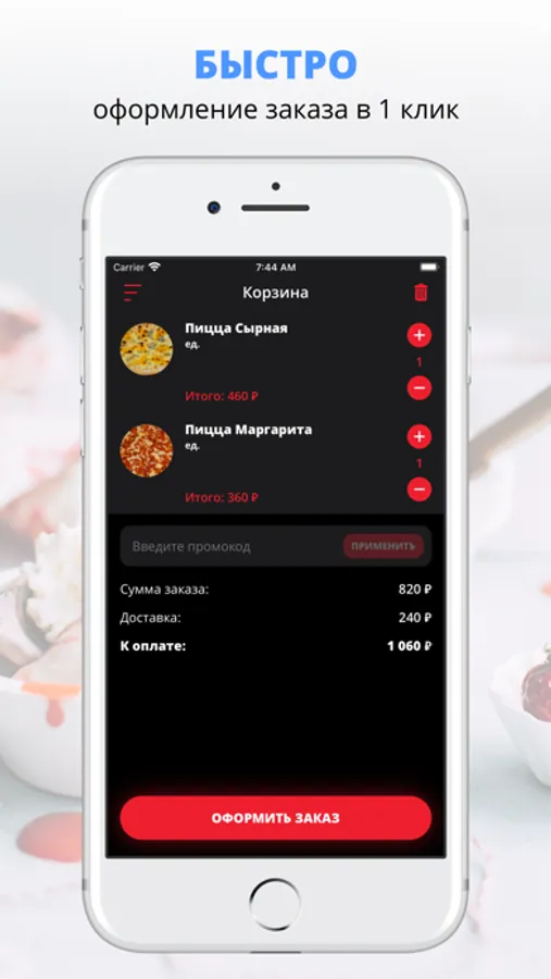Скачивайте наше приложение, оформляйте заказ и наслаждайтесь любимой едой, где бы Вы ни были! Приятного аппетита!