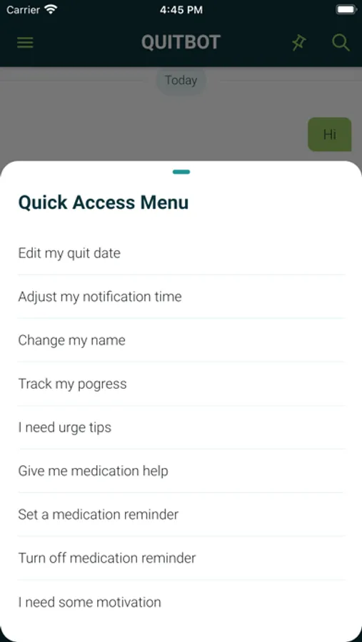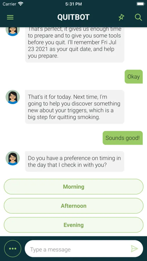 The QuitBot app is a chatbot program created for a clinical study by researchers at the Fred Hutchinson Center. The app consists of a virtual coach that helps people quit smoking cigarettes by providing a step-by-step guide to quitting, tools to help deal with urges to smoke, help staying motivated while quitting, and tips for coping with slips, withdrawal, and relapse.