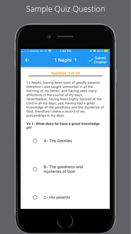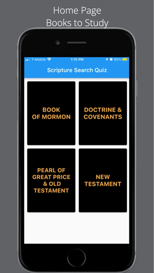Scripture Search Quiz is an app that will guide users through the Book of Mormon, Doctrine and Covenants, New Testament, Pearl of Great Price, and Old Testament using search questions for every verse. This app will help users deepen understanding as they search for principles and key ideas. Scripture Search Quiz is designed to not only guide children and new readers of the scriptures but to also deepen learning and application for experienced readers. This app is not licensed by or a product of The Church of Jesus Christ of Latter-day Saints, and these search questions represent the views and perspectives of the creators of the app and not those of The Church.