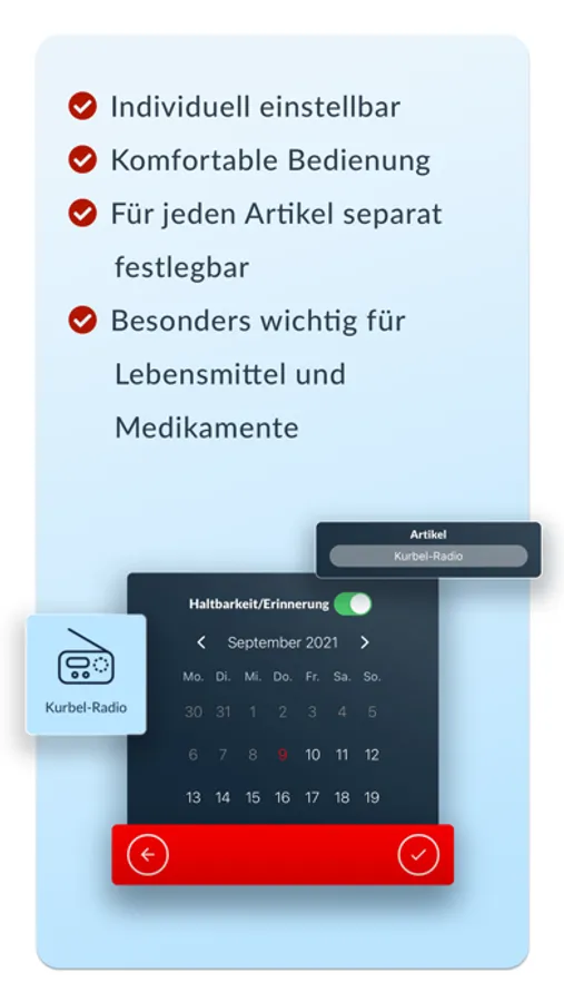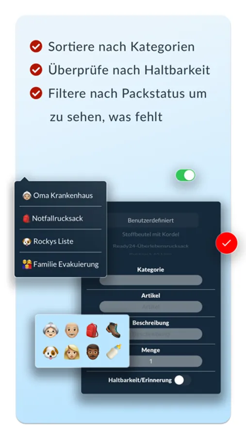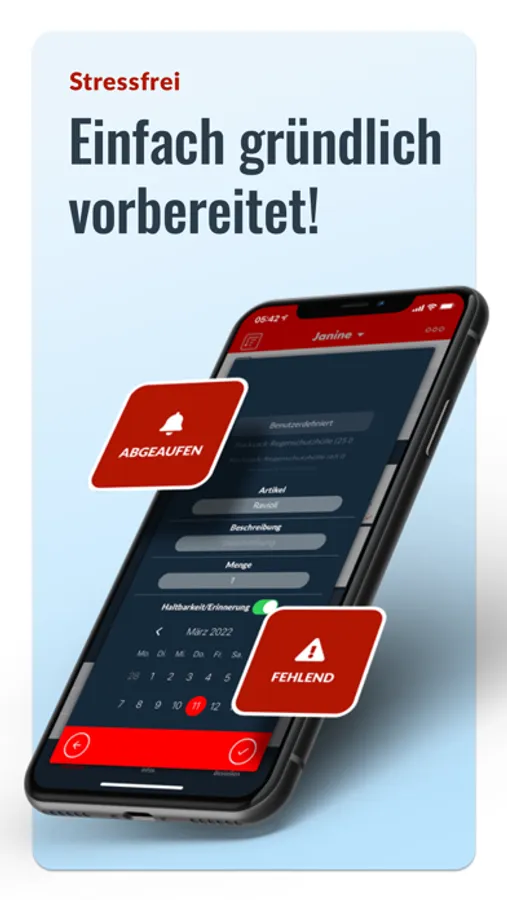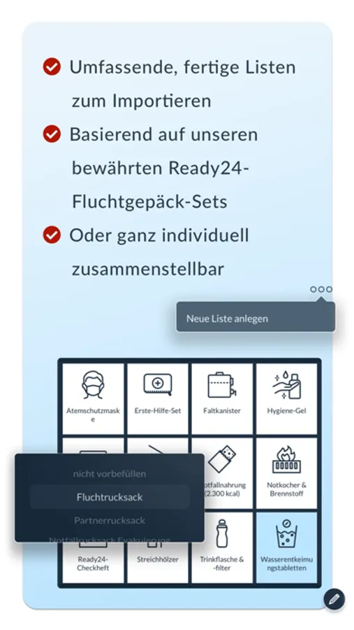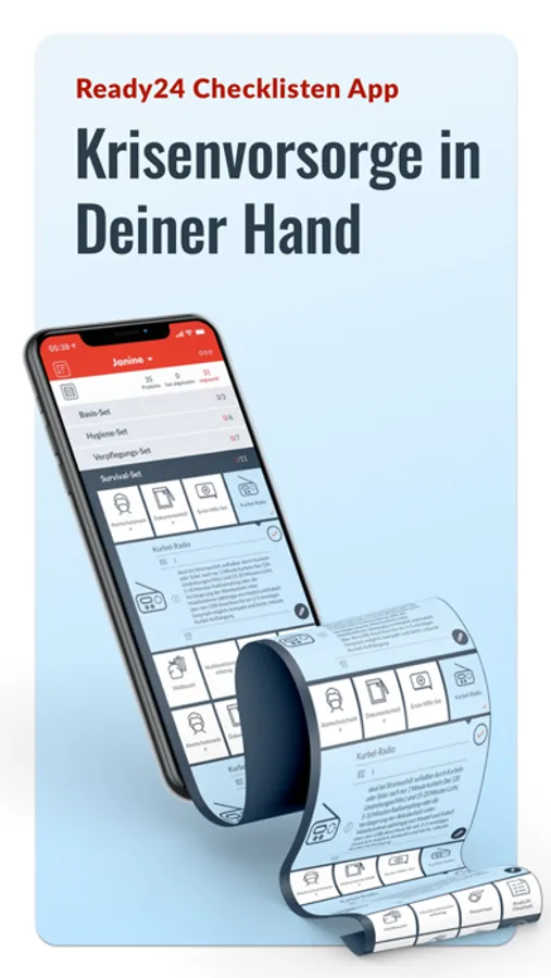 In wenigen Minuten deinen Fluchtrucksack packen, dank der Ready24-Packliste. Kostenlos erhältst du Tipps zum Verhalten in verschiedenen Notsituationen. Außerdem gibt es nützliche Hinweise zum Gebrauch deiner Survival-Ausrüstung. Jetzt auch mit Erinnerungsfunktion, wenn Produkte in deinem Notfallrucksack ablaufen und du deine Notration oder andere Ausrüstung erneuern solltest.