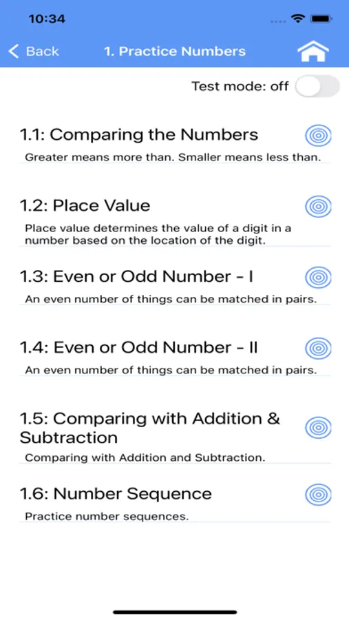 * App Mode: Practice/Test. In practice mode, the student will get the same questions every time unless they change the setting. In test mode, the questions are randomized.
