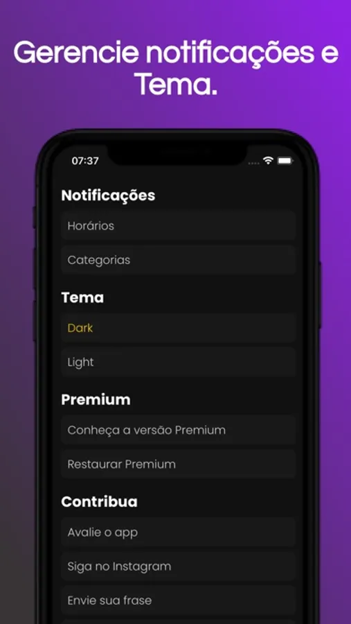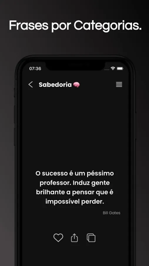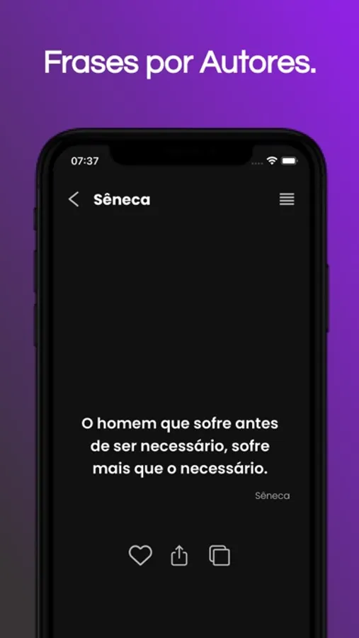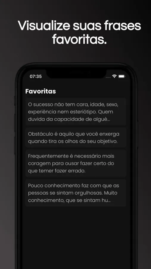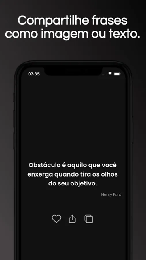 Além disso, você pode definir horários para receber todos os dias notificações com frases. Outro diferencial é a possibilidade de compartilhar a frase como texto ou imagem.
