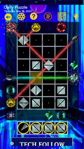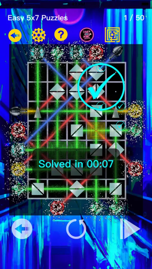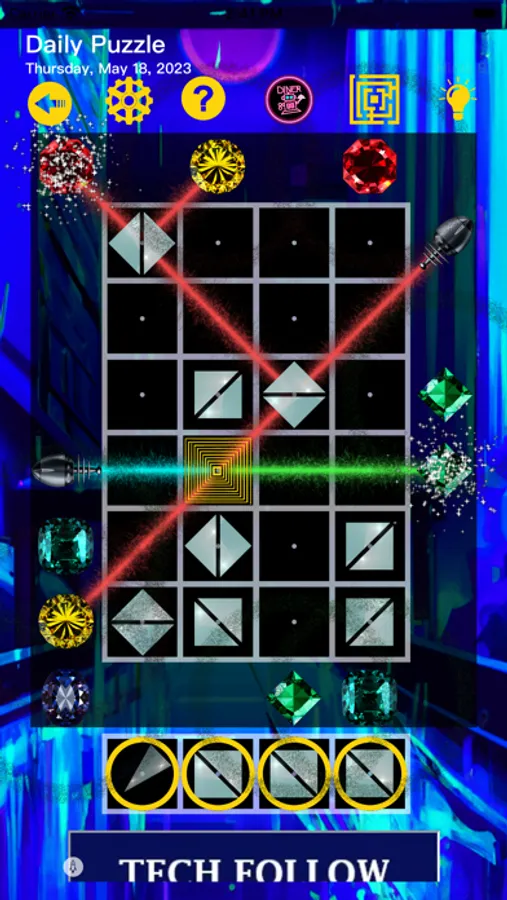 Each puzzle includes Red, Green and Blue Laser Beams. Drag and drop mirrors, beamsplitters and prisms onto the grid to blend, split, and reflect Laser Beams onto Jewels of seven different colors.