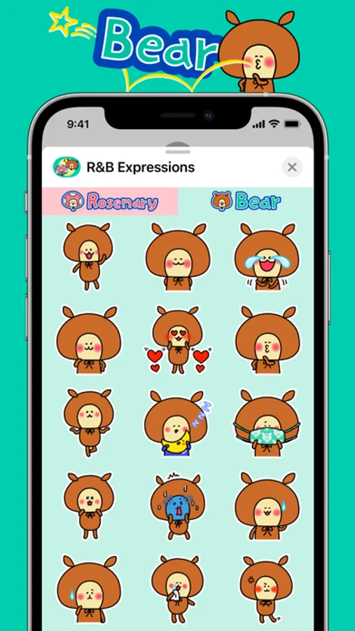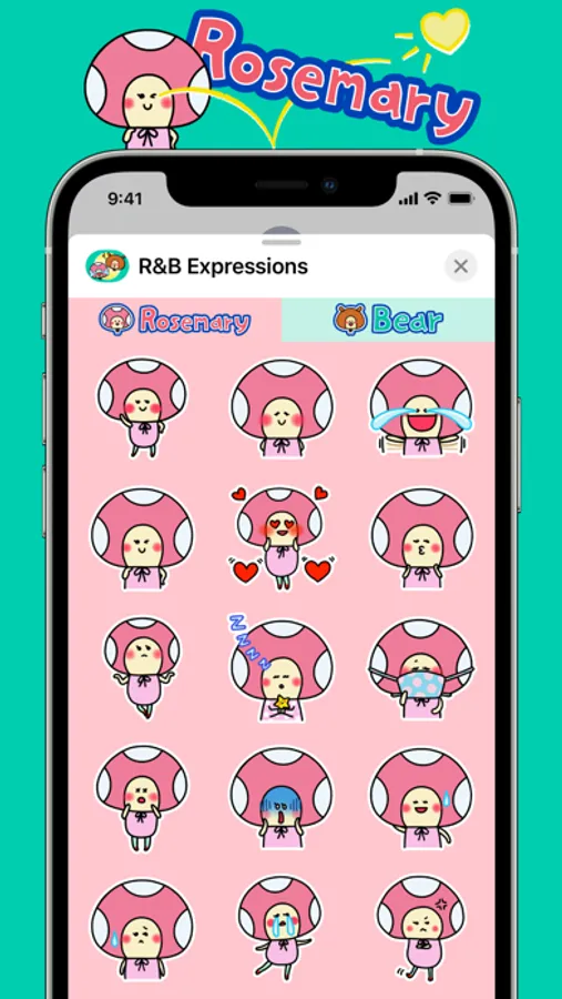 There are Rosemary and Bear stickers for each emoji-style expression.