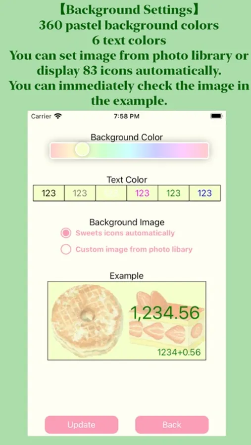 - Set a photo album photo, image, or 83 types of sweets illustrations as the background image.