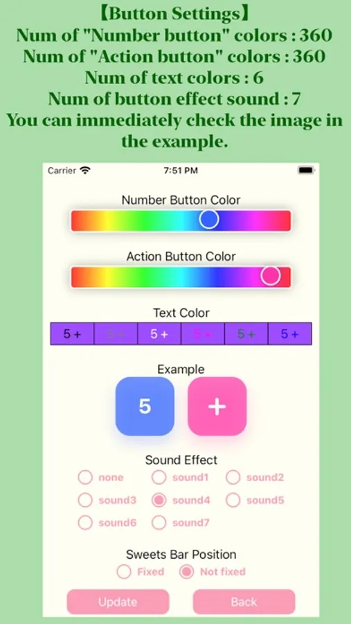 - Set the background color of the number buttons and action buttons other than numbers from 360 colors respectively.