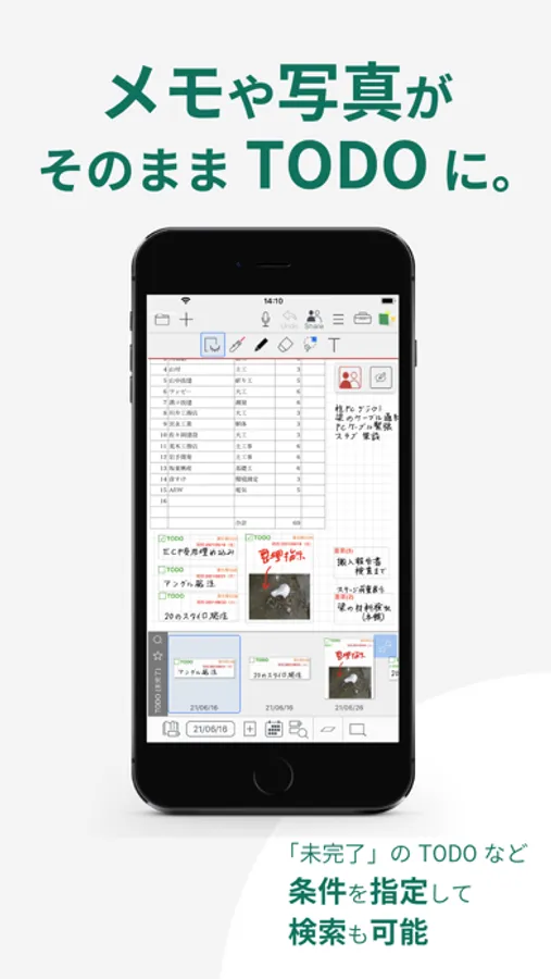 ・メモや写真にもTODOタグを付けて管理できるので、仕事のやり忘れを防ぎます。
