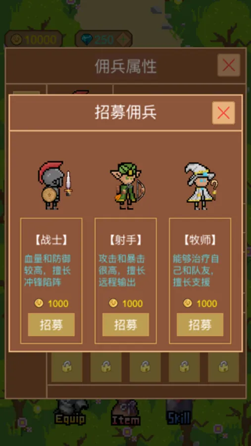 3种职业:战士,射手,牧师,自由组合你的佣兵队伍。