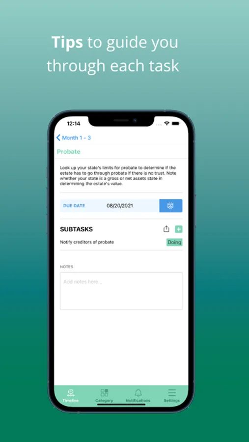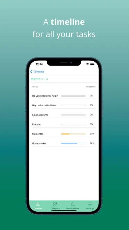 Track all estate settlement tasks by either timeline they are due or by category such as physical assets or funeral planning.