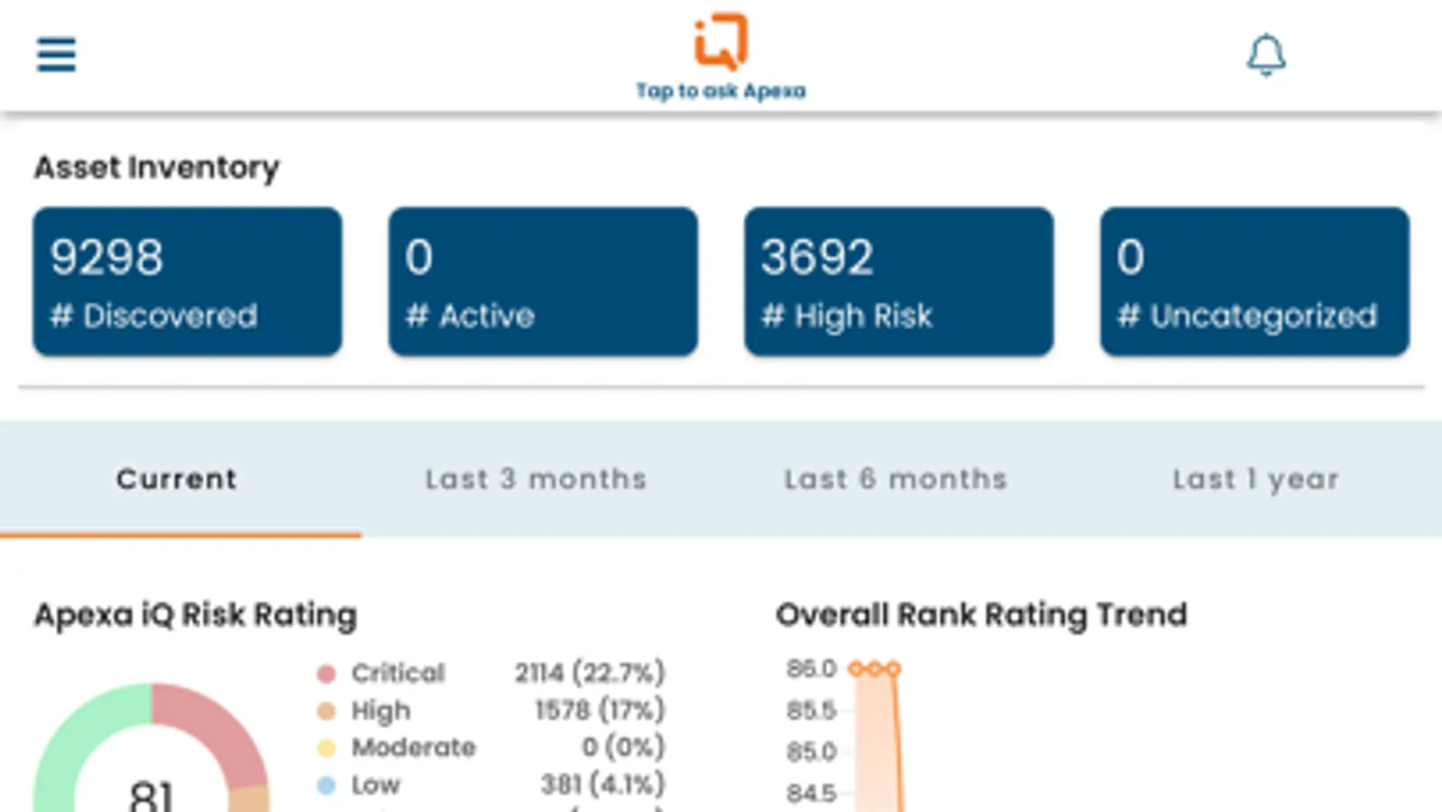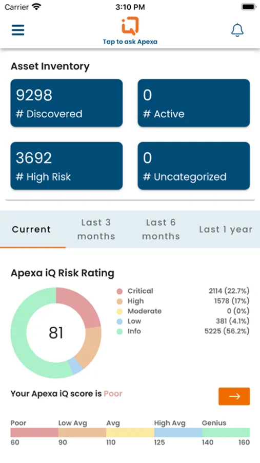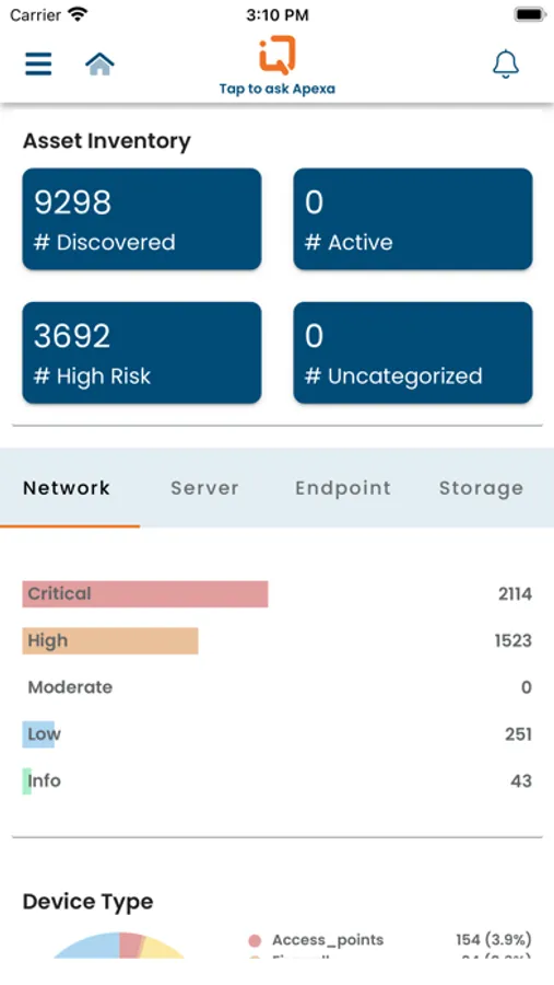 ApexaIQ app is meant to be used with our unique SaaS solution that helps organizations to establish comprehensive up-to-date visibility and IT hygiene of their entire infrastructure in a single pane of glass. ApexaIQ Intelligently assesses, unifies, enriches and then scores their IT landscape in a single risk rating score. ApexaIQ provides security gaps, automatically takes actions on reducing risks and provides access to audit, KPI, regulatory compliance and SLA reports. This voice enabled intelligent app gets you the information that you need at your voice command.
