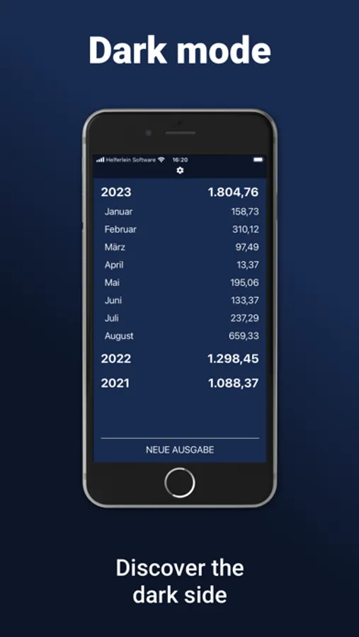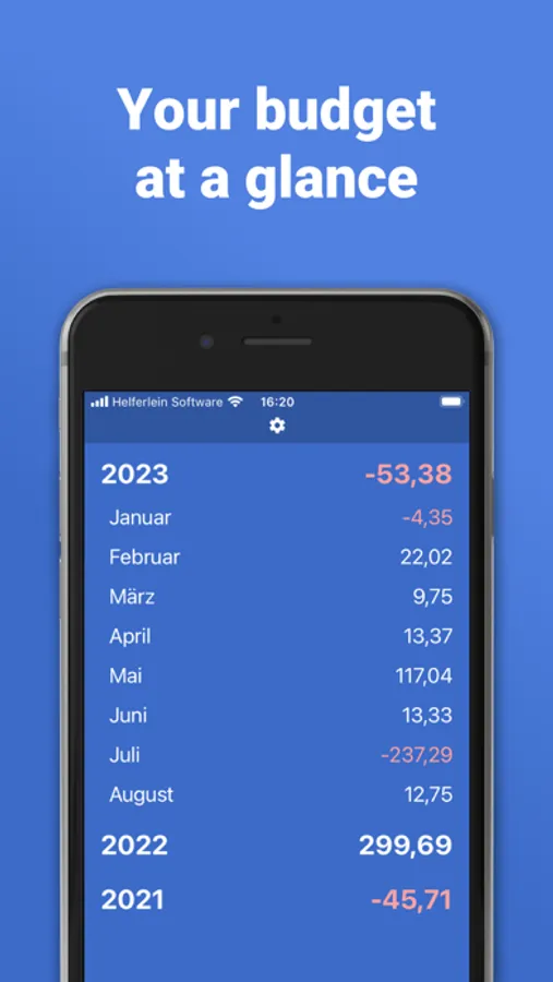 In budget mode, you can see your remaining budget per year, month and category at a glance. Income and expenses are added up to your total budget and you can see early on whether you need to be a little more careful or can afford something great.