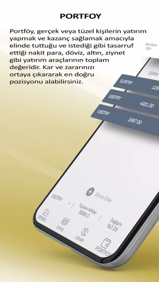 Portföy, gerçek veya tüzel kişilerin yatırım yapmak ve kazanç sağlamak amacıyla elinde tuttuğu ve istediği gibi tasarruf ettiği nakit para, döviz, altın, ziynet gibi yatırım araçlarının toplam değeridir. Kar ve zararınızı ortaya çıkararak en doğru pozisyonu alabilirsiniz.