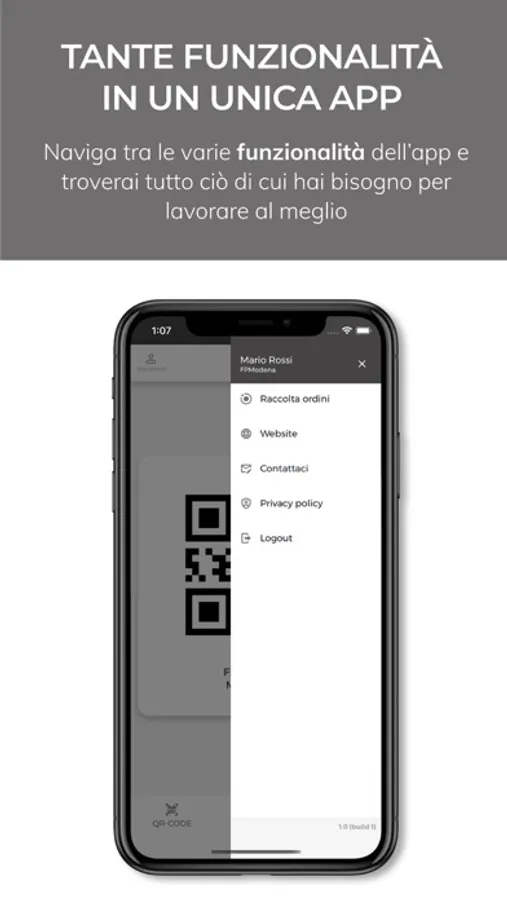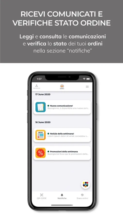 Grazie alle sue funzionalità potrai avere il tuo QR code personale, ricevere notifiche di comunicati e visualizzare lo stato dei tuoi ordini.