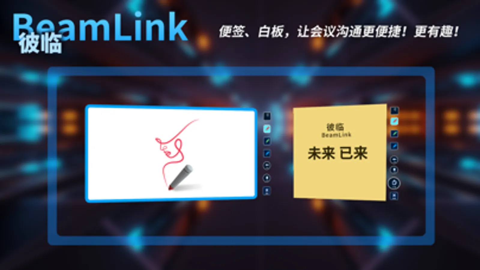 在会议中用户还可以一起操作白板、书写便签、查看3D模型,所有这些操作都像是在一个真正的会议室里真正发生的感受。