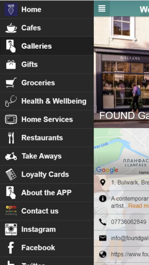 Cafes, Galleries, Gifts, Groceries, Health & Wellbeing, Home Services, Pubs & Bars, Restaurants, Instagram, Facebook, Twitter, Places of interest, Coupons, Scratch Card