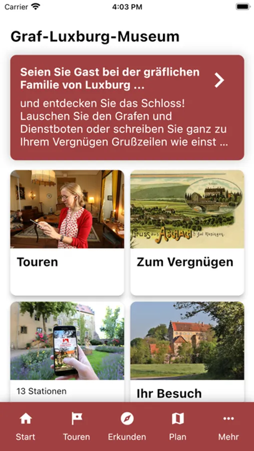 Mit der App des Graf-Luxburg-Museums lauschen Sie bei Rundgängen per Audioguide den Unterhaltungen der gräflichen Familie und ihrer Dienstboten. Wie einst die Grafen können Sie Grußzeilen verschicken – als digitale Postkarte oder Sprachnachricht.