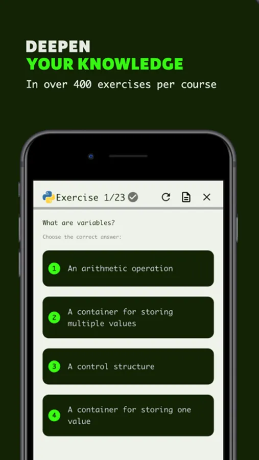 What sets us apart? A real code editor, the opportunity to earn a certificate, and a comprehensive offering of the most important programming topics. You can always track your learning progress and create study plans according to your schedule.