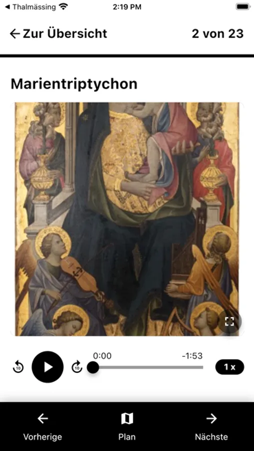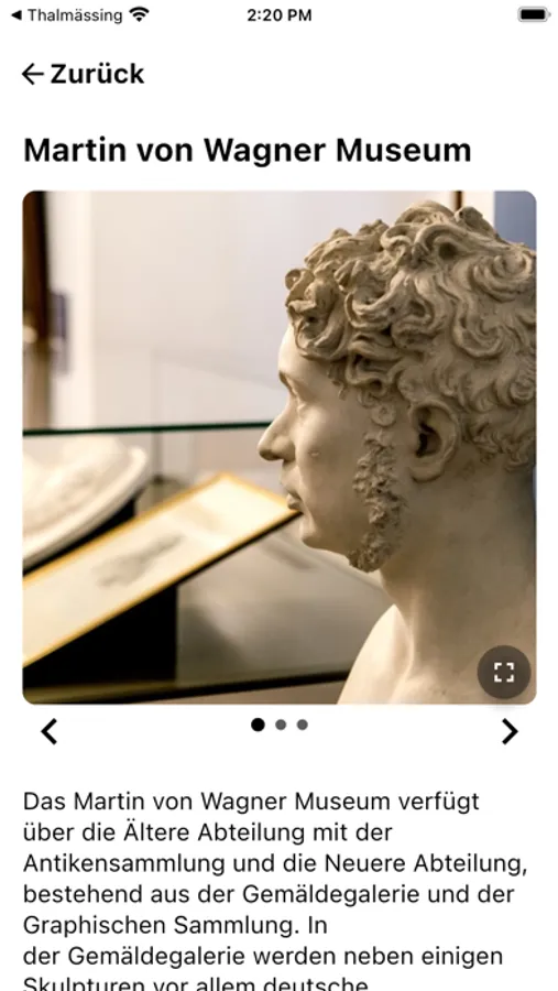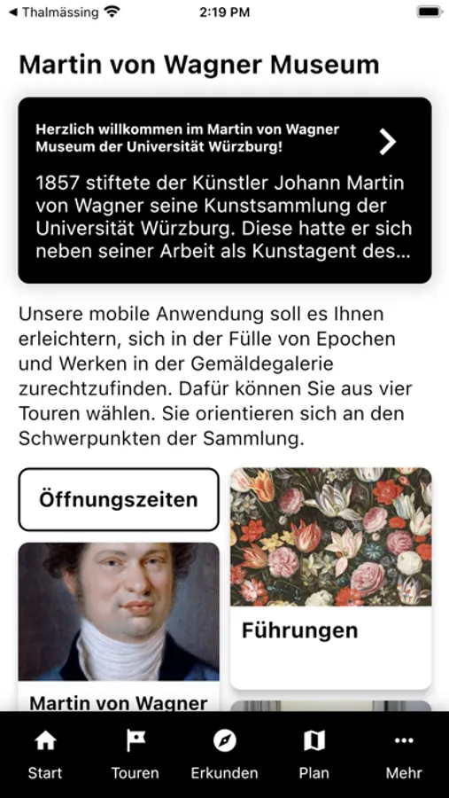 Darüber hinaus bietet die App Informationen zum Martin von Wagner Museum der Universität Würzburg, zu den Öffnungszeiten und einen Raumplan der Gemäldegalerie.