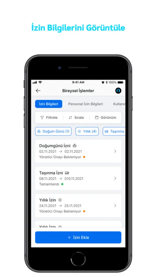 Şirket çalışanlarının, izin hakediş, izin detay bilgilerinin, giriş, düzeltme ve görüntüleme işlemlerinin yapıldığı modüldür. Bu modülde farklı izin hakedişleri olan personeller için farklı izin hak ediş süreleri tanımlanabilir. Kullanıcı tarafından istenilen sayıda izin türü tanımlanabilir. Tanımlanan izin türleri için varsa minimum maximum kullanma süreleri, herhangi bir cinsiyete yada şirkete bağlı olup olmadığı, hizmet yılından düşülüp düşülmediği, yıllık izin olup olmadığı, tatil günlerinin dikkate alınıp alınmayacağı gibi izin türüne özel tanımlamalar yapılabilir. İzin bilgileri bordro modülüne aktarabilir.