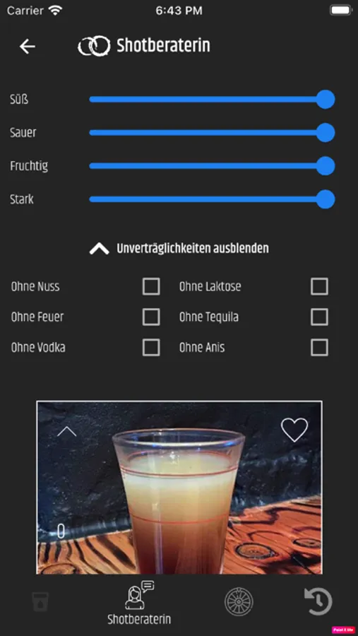 Du bist unentschlossen, welchen Shot du als nächstes trinken möchtest? Mit der Shot-Beraterin stellst du ganz einfach per Slider ein, wie süß, fruchtig, sauer und stark dein nächster Shot sein soll. Hast du eine Nussallergie oder magst keinen Tequila in deinem Shot? Kein Problem! Auch einige Allergene und Zutaten kannst du ausschließen. Ganz nach deinen Vorlieben werden dir die passendsten Shots angezeigt.