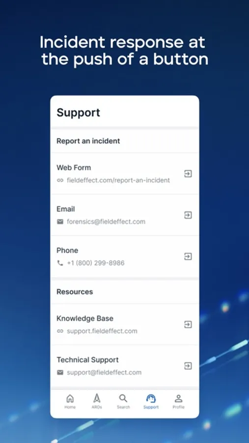 In case of emergency, get in touch with Field Effect’s world-class incident response team with the push of a button. Instantly get the cyber security support you need when you need it most, no matter where you are.