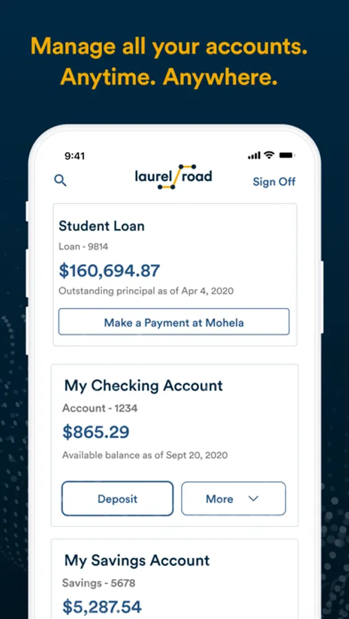 Get fast, easy access to all your Laurel Road accounts in one convenient place. Bank securely with the Laurel Road Mobile app: view your account balances, monitor your credit score, send and receive money with Zelle®, deposit checks, manage your bill payments, and more—all available 24/7, right from your mobile device.