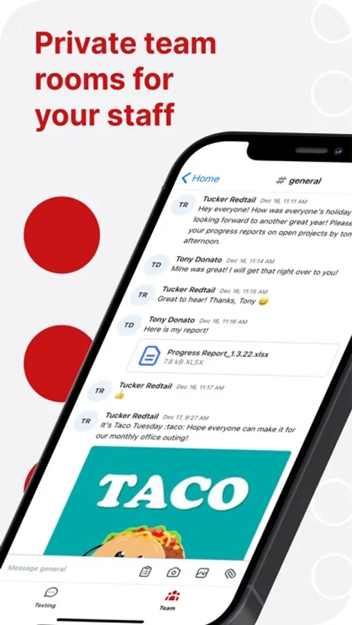 • unlimited channels for group team chats and unlimited private direct messaging for one-on-one conversations with other team members