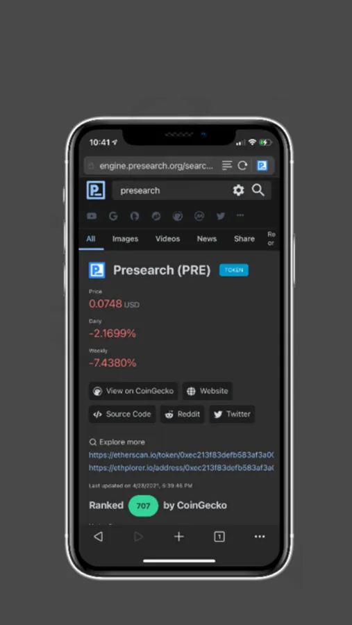 The Presearch Privacy Browser is a fork of a popular privacy brower. Many of the designs and functionalities are the same, but allows the user to use Presearch on a mobile device.