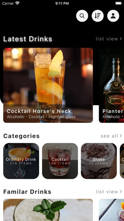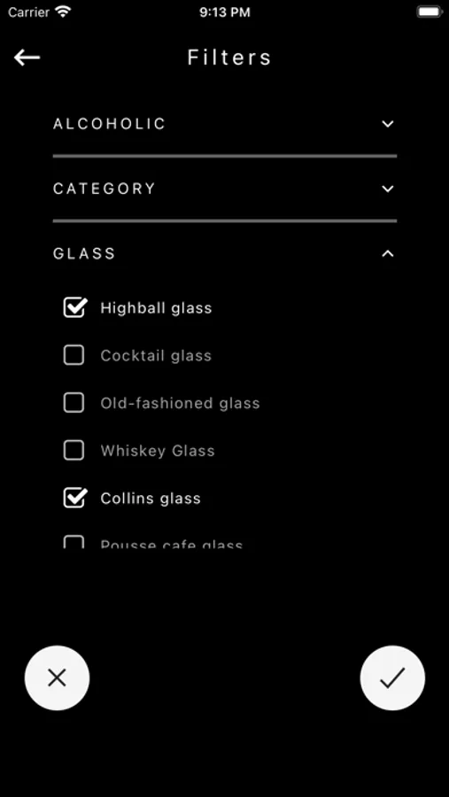 Find the Drink you're looking for by name or using multiple filters that allow you to search by type (Alcoholic, Non-alcoholic, Optional), category (all the categories we mentioned in the previous section) and even by serving glass (Highball, Collins, Shot, Cocktail, Whiskey, and much more).