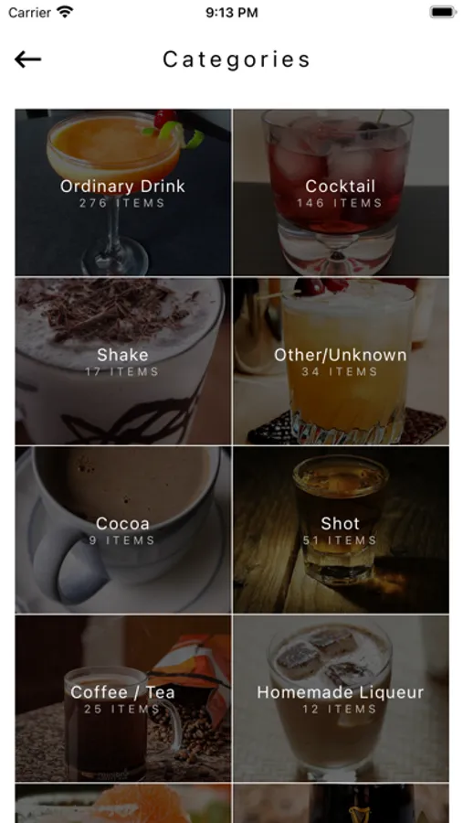 selecting category in the categories screen will present all the recipes of the cocktails from the selected category. Before selecting, you can see how many drinks there are in each of the categories: Ordinary Drink, Cocktail, Shake, Cocoa, Shot, Coffee / Tea, Homemade Liqueur, Punch / Party Drink, Beer, Soft Drink, Other / Unknown.