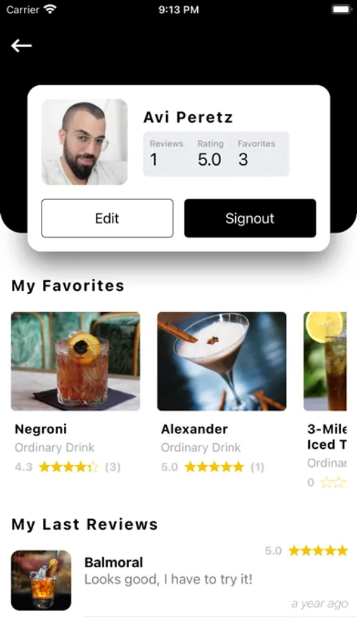 As a registered users you will have a profile page where you can add your photo and edit your personal details. You will be able to rate a drink (1-5 stars) and put a comment. A record with your name, your photo (if available) and your review will appear on the Cocktail's reviews page, that way, other users can get a better indication of the Drinks. In addition, you can mark Drinks as a favorite so that you can easily find them next time. All your favorite Drinks as well as your reviews will appear on your profile page. Other users will be able to visit your profile page and see your favorite list and your review list.