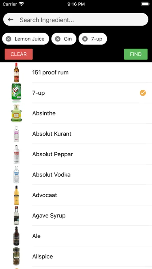 Select the ingredients in the ingredients screen and all the Drinks that contain combination of these ingredients will be shown.