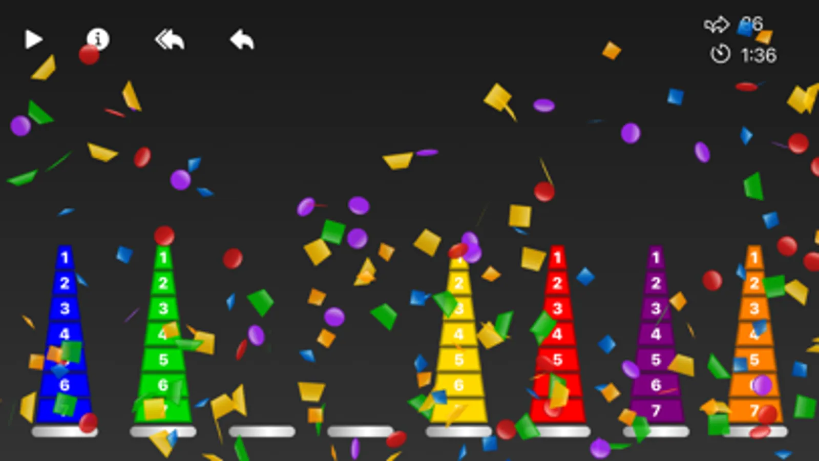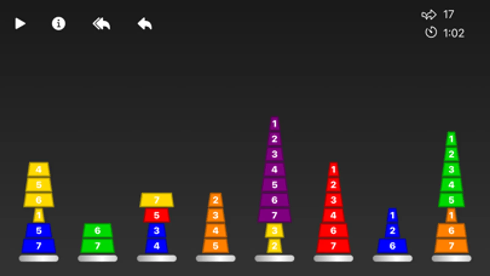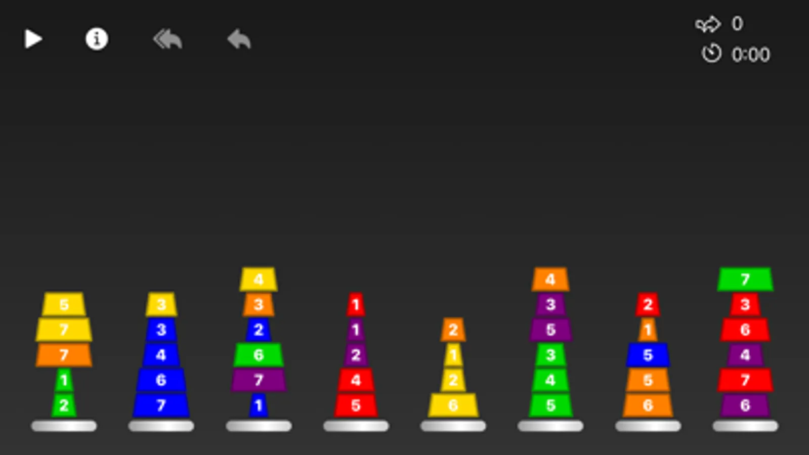 Tower Mixup is a puzzle game based on the Tower of Hanoi. You’re given 7 pieces in each of 6 different colors and your job is to put them all back together. Pieces can only be moved onto pieces of the same color that have a larger number than the piece being moved. When consecutive pieces are stacked, they “snap” and move together thereafter.