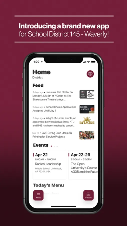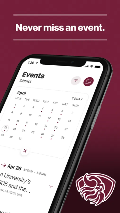 The event section shows a list of events throughout the district. Users can add an event to their calendar to share the event with friends and family with one tap.