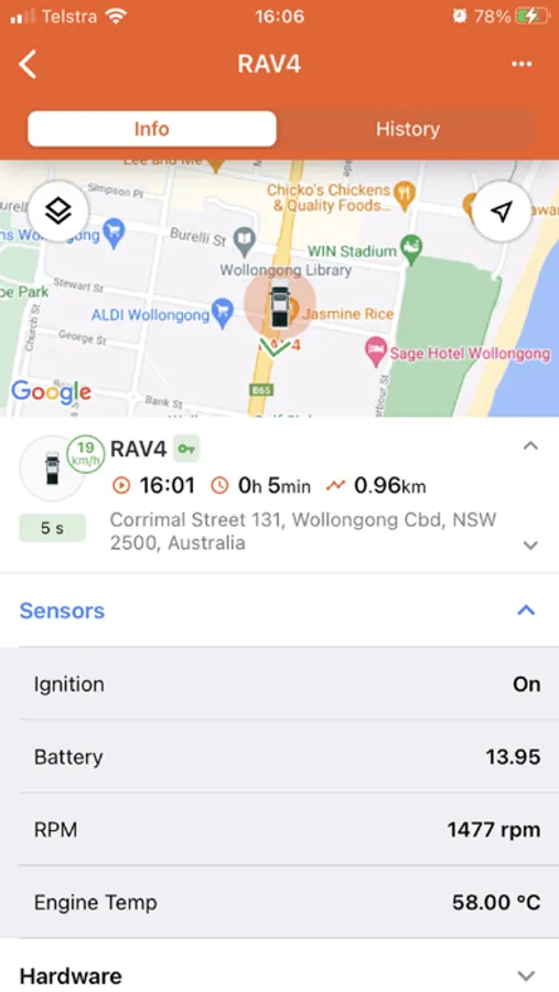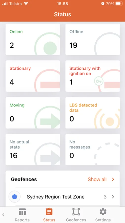 - Status dashboard. Quick and easy access to stats on which of your vehicles are moving, stopped, or within geofences.