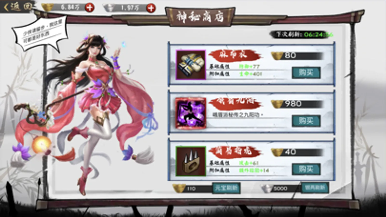神秘商店出售各种武学、装备和材料。在这里享誉武林的倚天剑屠龙刀,丐帮的不传之秘打狗棍法应有尽有。