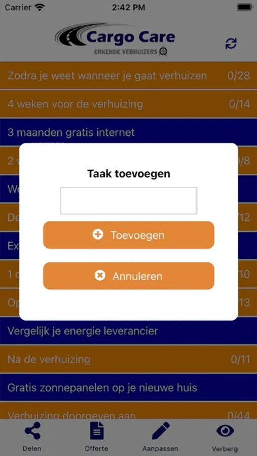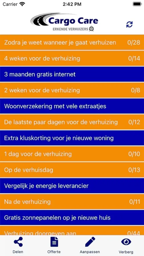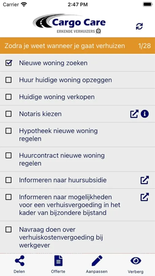 Met de app weet je tijdens alle fases van je verhuizing wat je moet doen en kun je zelf ook taken toevoegen, naast de handige taken en aandachtspunten die de app al voor je aangemaakt heeft, waaronder: