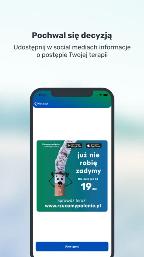 → Udostępnianie z poziomu aplikacji w social media informacji o postępie Twojej terapii rzucenia palenia.