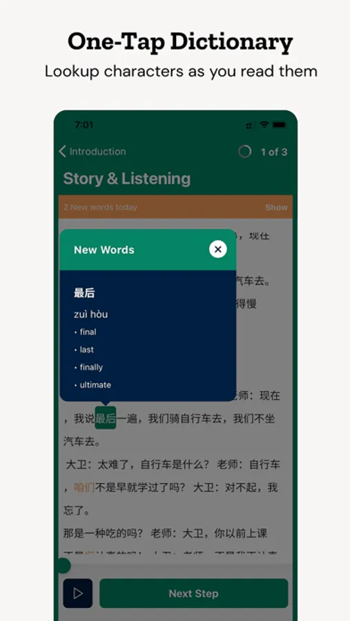 • Tap a Word for Definition & Example Sentences → Learn New Characters