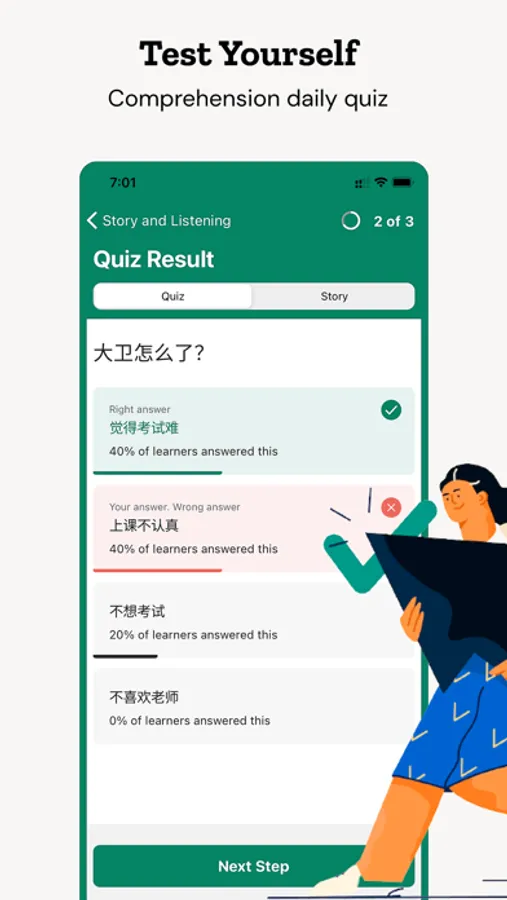 • Daily Unique Story in Chinese for your level → Practice your Reading