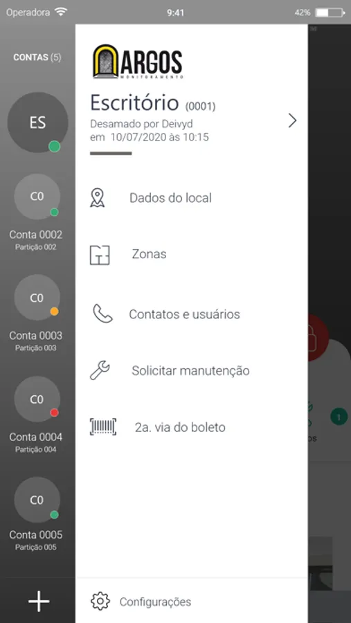 O Argos Alarme é um aplicativo móvel onde o cliente monitorado pode acompanhar diretamente via celular ou tablet todas as atividades do seu sistema de segurança. Por meio do aplicativo, é possível saber o status do painel de alarme, armá-lo e desarmá-lo, visualizar as câmeras ao vivo, verificar eventos e ordens de serviço abertas, além de realizar chamadas telefônicas para contatos cadastrados no seu perfil. É a segurança que você precisa na palma da sua mão.