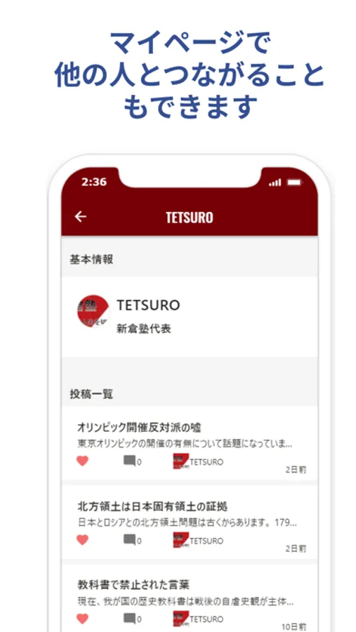 人間力について、日本の将来について、歴史について、こういったことを語り合える人に出会えるコミュニティを目指しています。