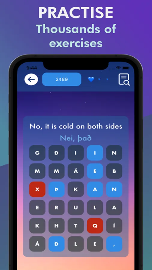 Pay attention! You will only advance level if you solve enough exercises correctly. Label Icelandic is designed to make you think before answering!